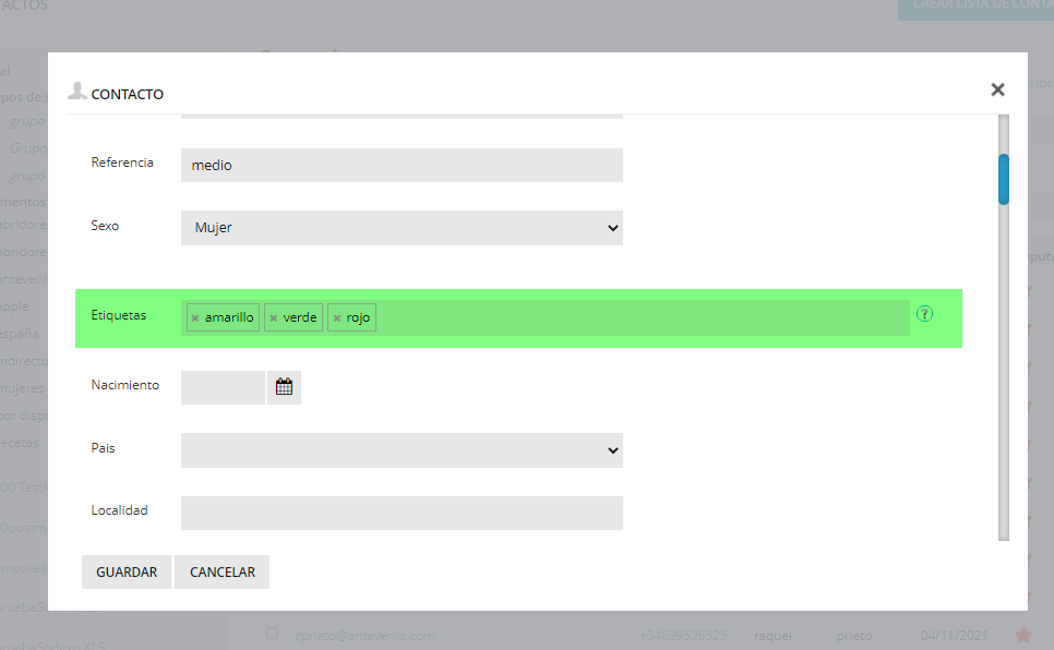 3.- Añadiendo la etiqueta en el contacto manualmente. Para ello tienes que ir a contactos, la lista en cuestión que contenga el contacto a editar, pinchar sobre su email y rellenar el campo «Etiquetas».