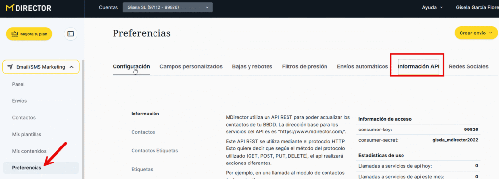 El píxel de venta es una alternativa al API de Ventas del servicio de Email Marketing. Toda la información sobre el API está incluida en las preferencias de la sección «Email Marketing», a la que podrás acceder desde el menú lateral izquierdo en la pestaña «Información API».