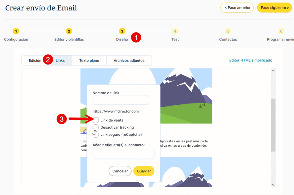 Para que funcione, has de implementar el píxel de venta dentro de tu web, en las páginas de venta. Para que se traqueen los enlaces de una comunicación y se controlen las ventas a través de esos enlaces es necesario activar cada enlace como píxel de venta dentro del paso «3. Diseño» de creación de un envío, en la pestaña “Links”. Debes de dar clic en el link correspondiente para que se despliegue la ventana correspondiente.