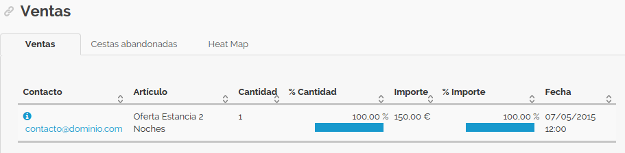 En la parte inferior de la sección se desplegará una tabla donde se muestran los contactos que han completado la venta, el artículo comprado, el importe, cantidad y fecha de compra: