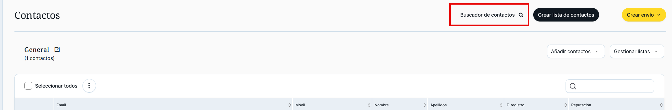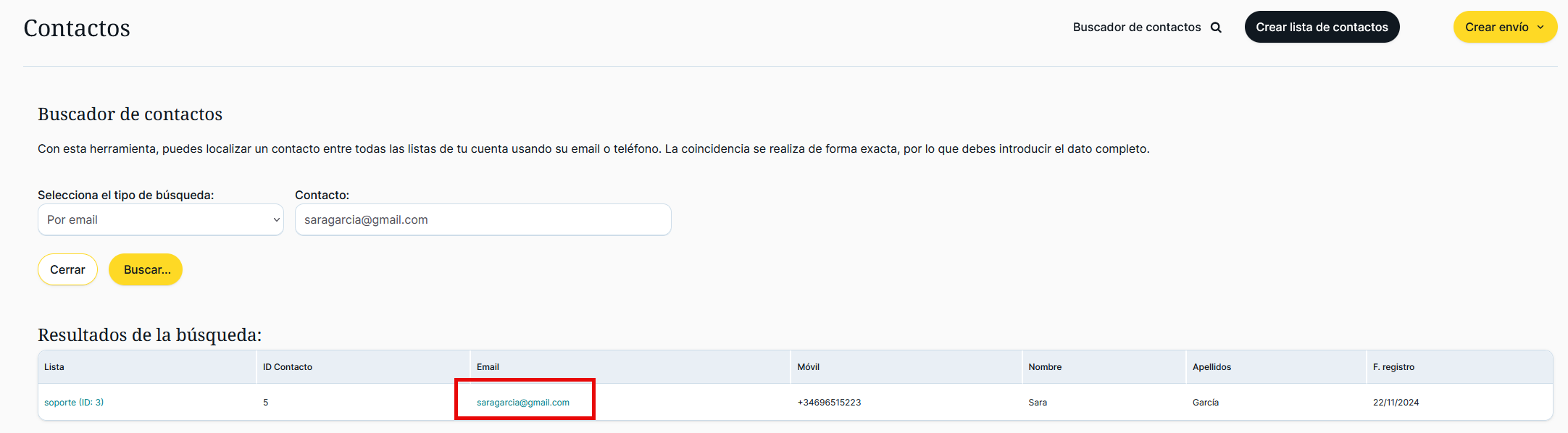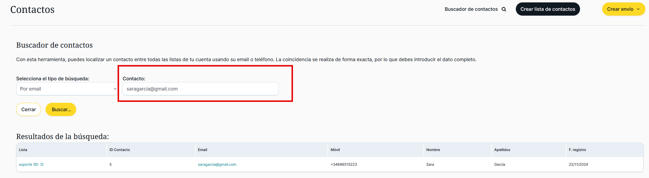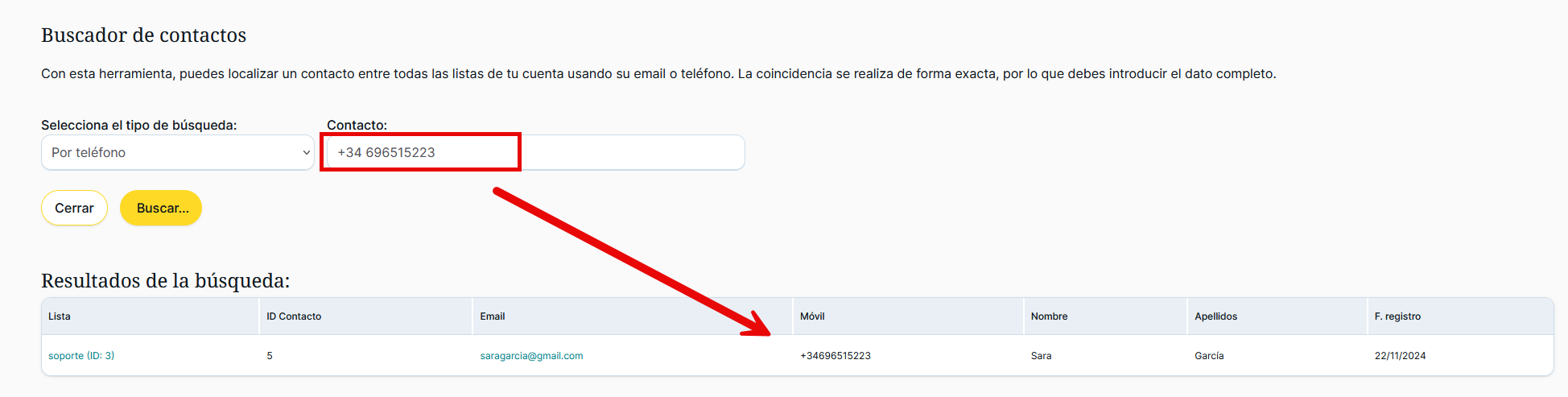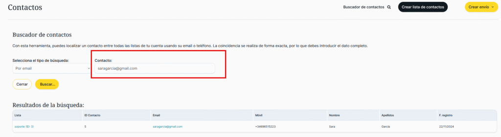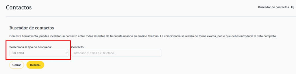 Esta herramienta permite localizar contactos entre todas las listas de contactos de la cuenta usando el email o el teléfono del contacto que se pretende encontrar. La coincidencia se realiza de forma exacta, por lo que se debe introducir el dato completo:
