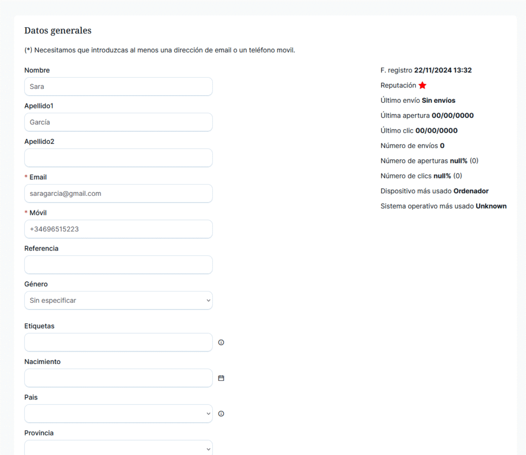 Si se pincha sobre el email, se abre una ventana modal que permite editar los datos del contacto: