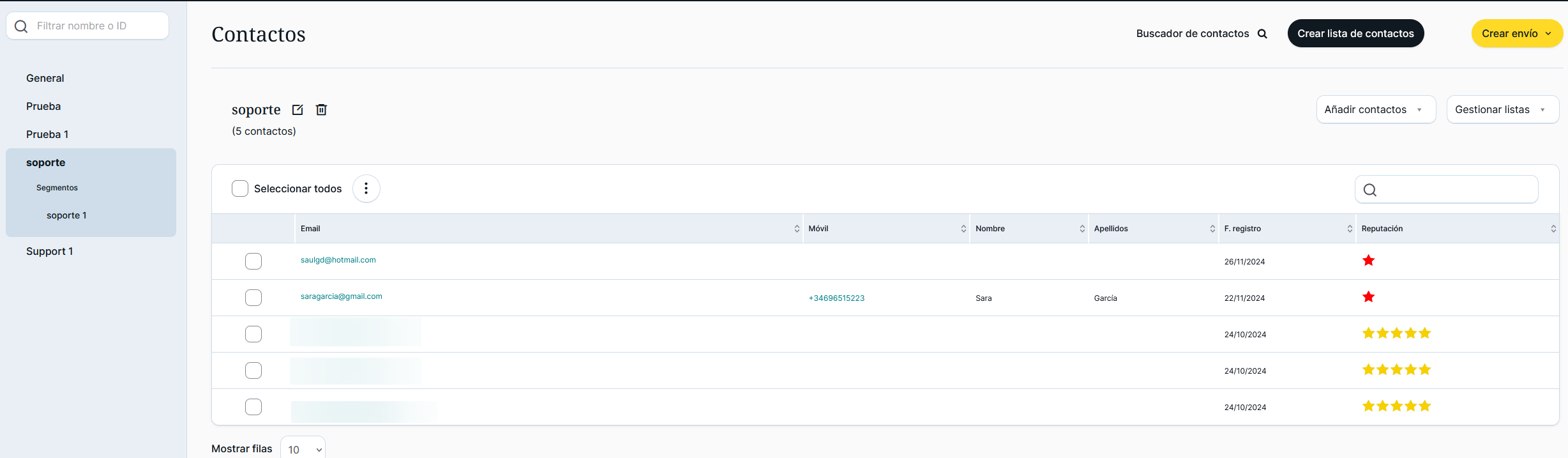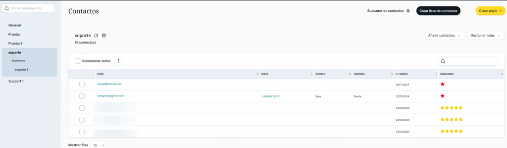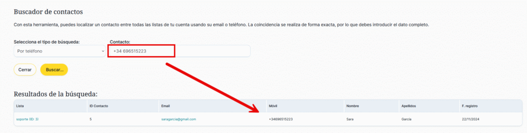 Como se aprecia en la imagen, el buscador muestra todas aquellas listas en las que ha sido importado el contacto.