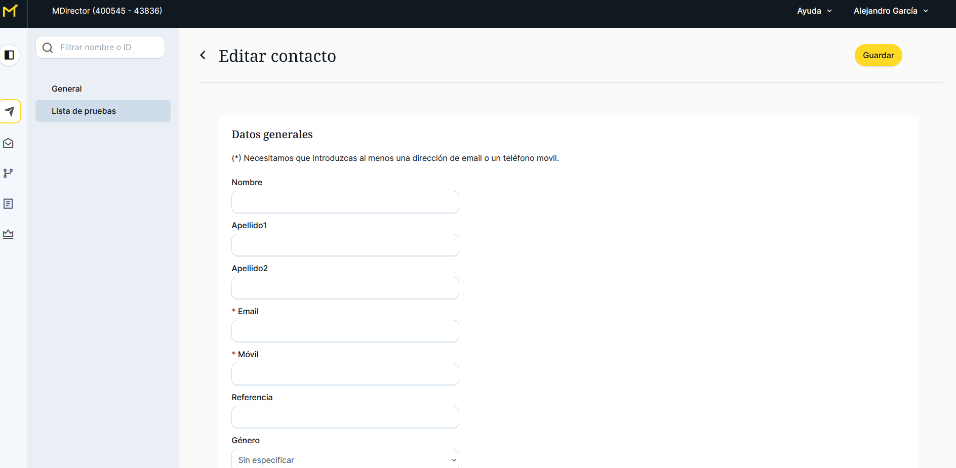 Antes de añadir contactos con una entrada manual, debes crear una lista de contactos o acceder a la lista «General». Si todavía no has hecho esto y no sabes cómo hacerlo, visita este artículo: https://mdirector.zendesk.com/hc/es/articles/6693916588946-Gesti%C3%B3n-de-listas-de-contactos