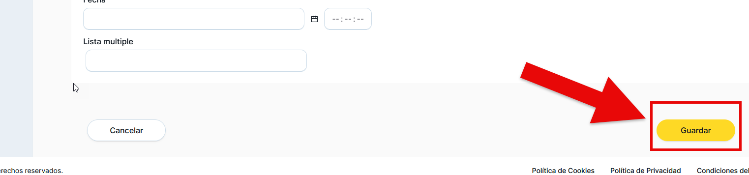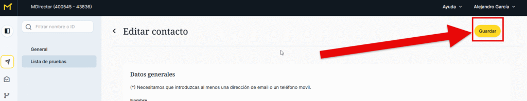 Para guardar la información del formulario es muy importante que recuerdes pulsar el botón amarillo de «Guardar», que está visible tanto en el encabezado como en el pie de esta página. Si pulsas el botón de volver o abandonas la página de cualquier otra forma, la información del contacto no se guardará y este, por tanto, no se creará.