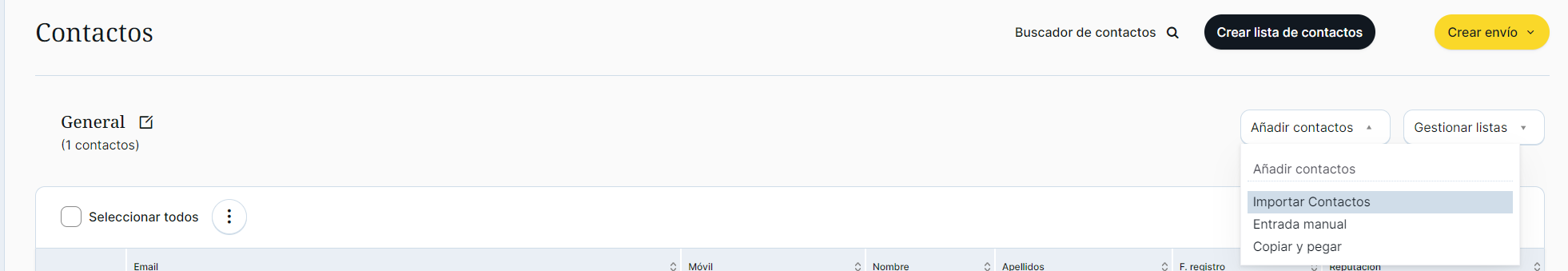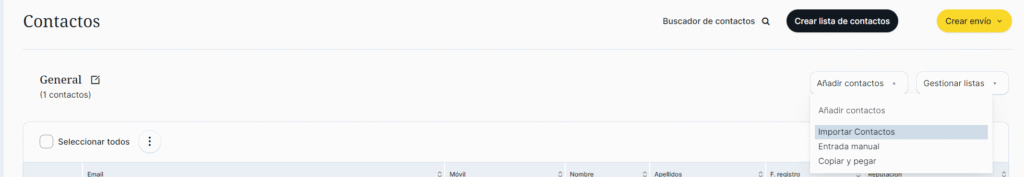 En MDirector existen distintas maneras de realizar esta importación de contactos. Estas aparecen haciendo clic en la lista creada y posteriormente haciendo clic en el desplegable «Selecciona una opción» donde aparecen tres métodos de importación: