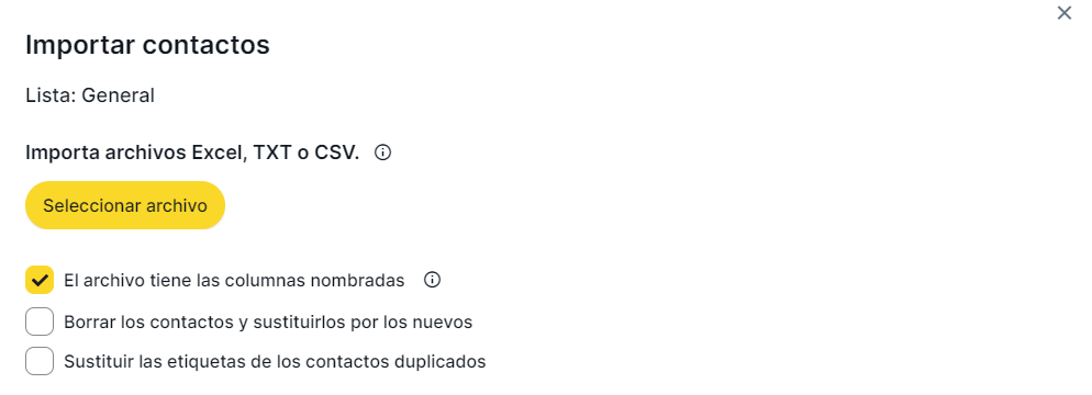 Esta opción es utilizada para importar contactos de forma masiva desde documentos con formato Excel, CSV o TXT: