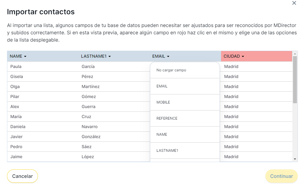 Posteriormente se deben hacer match en los campos predeterminados y personalizados con los de nuestra base de datos. y darle a “Continuar»: