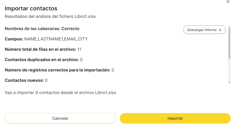 Una vez realizada la importación aparecerá un informe de la importación donde podremos consultar los contactos que se han importado nuevos, los que han sido modificados porque ya se encontraban en esta lista, las direcciones erróneas, fallidas o en bajas, etc.: