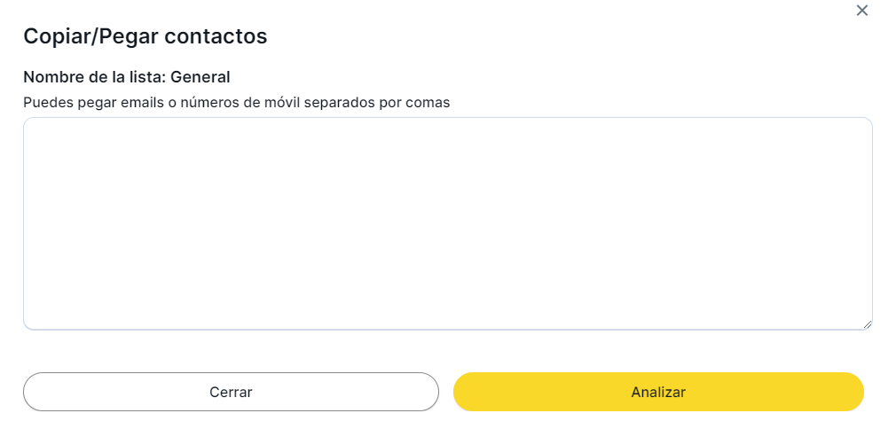 Esta opción permite importar una lista de emails o números de teléfono introducidos directamente, separados por comas: