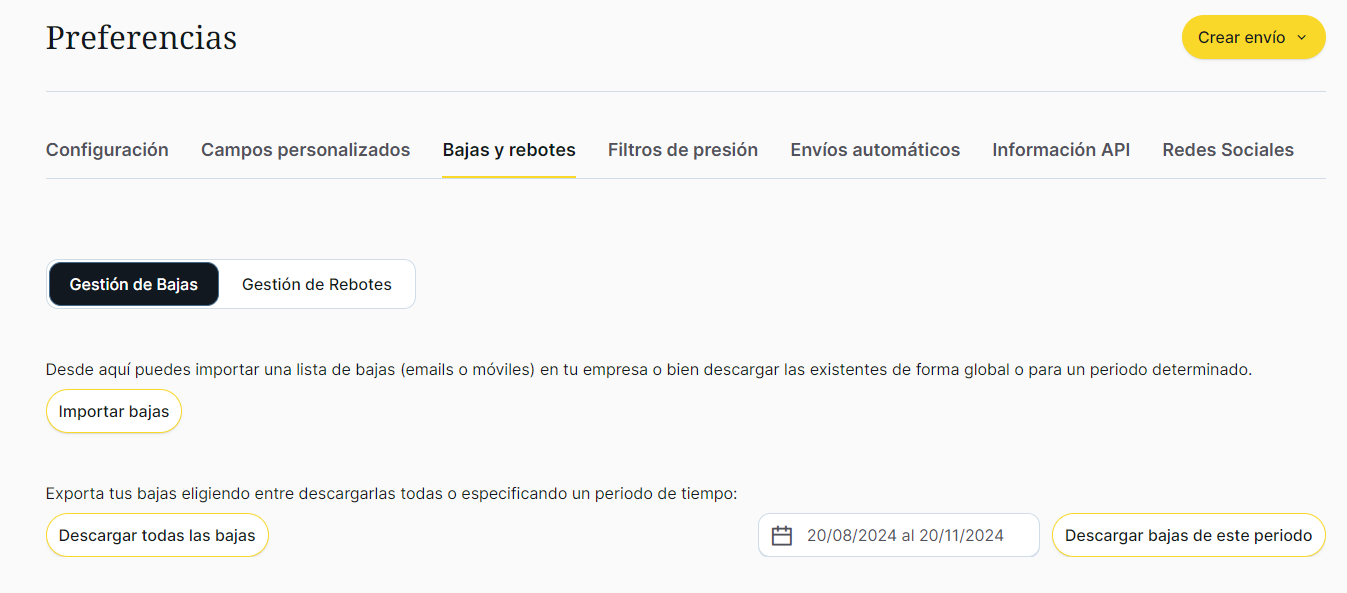 Una vez dentro se debe hacer clic en la pestaña «Bajas y Rebotes» y en el mismo apartado se puede descargar la lista de bajas totales o por un periodo de tiempo concreto siendo igual en el caso de la lista de rebotes: