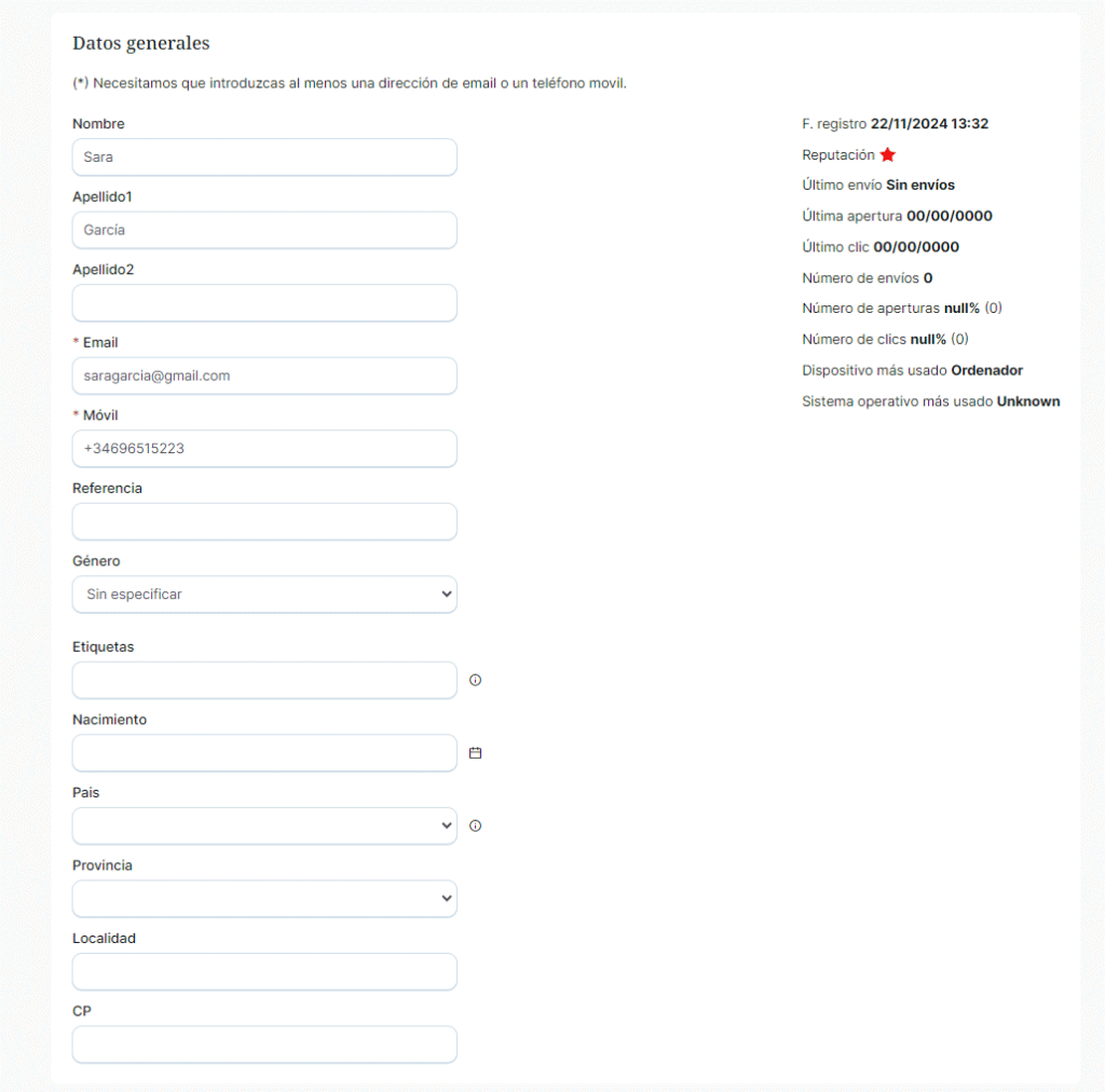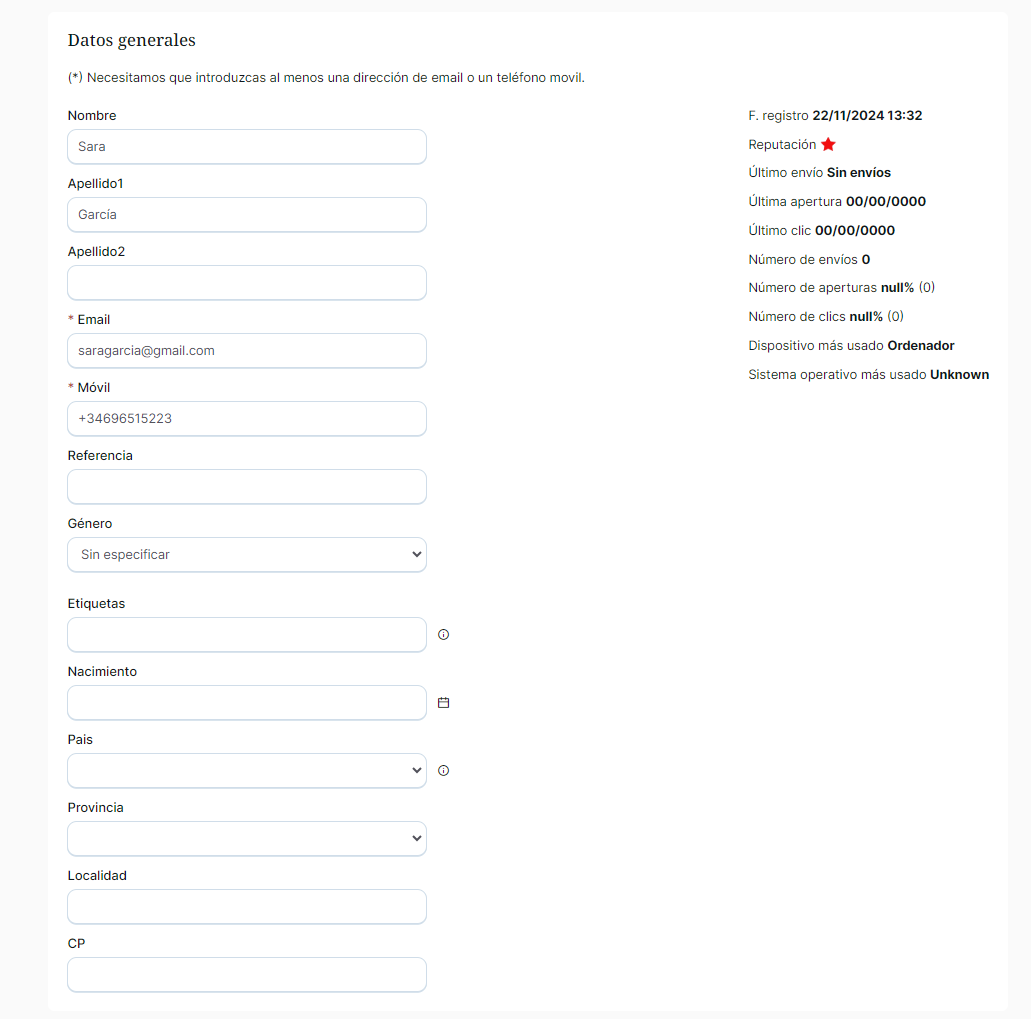 Haciendo clic en la dirección de un mail de un contacto pueden visualizarse todos los campos, los estándar: