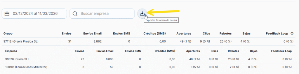 Puedes descargar la información en CSV desde el icono de descarga, como se muestra en la siguiente imagen: