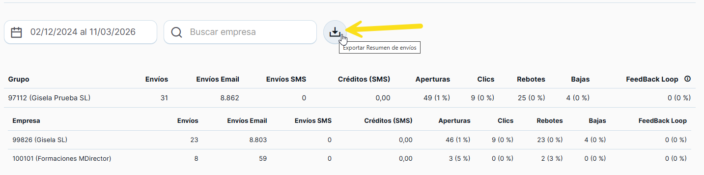 Nota importante: la información del resumen de envíos no incluye los envíos realizados durante el día actual aunque se incluya en el rango de fechas seleccionado.