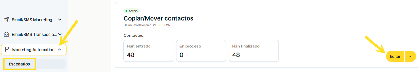 - Accede al escenario de Marketing Automation y pulsa el botón Editar.