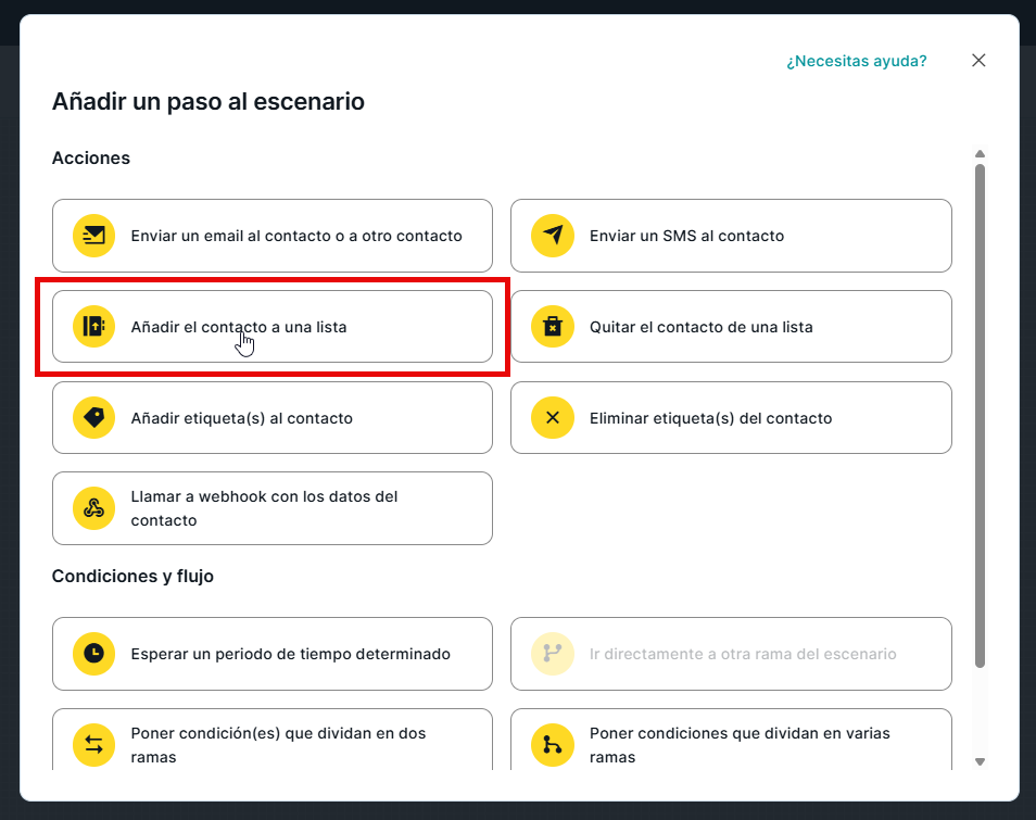 Para hacerlo, lo primero es hacer clic en el botón «+» dentro del editor del escenario y seleccionar la opción «Añadir el contacto a una lista», dentro de la categoría de «Acciones».