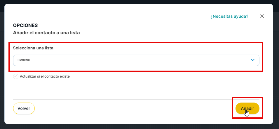 A continuación, utiliza el desplegable para seleccionar la lista a la que deseas que se añada el contacto y haz clic en el botón amarillo de «Añadir».