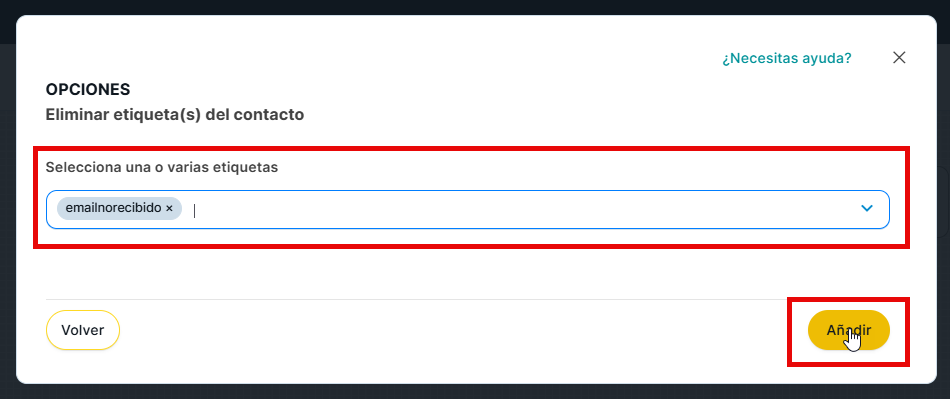 A continuación, selecciona la(s) etiqueta(s) que desees que se retire(n) y pulsa el botón amarillo de «Añadir».