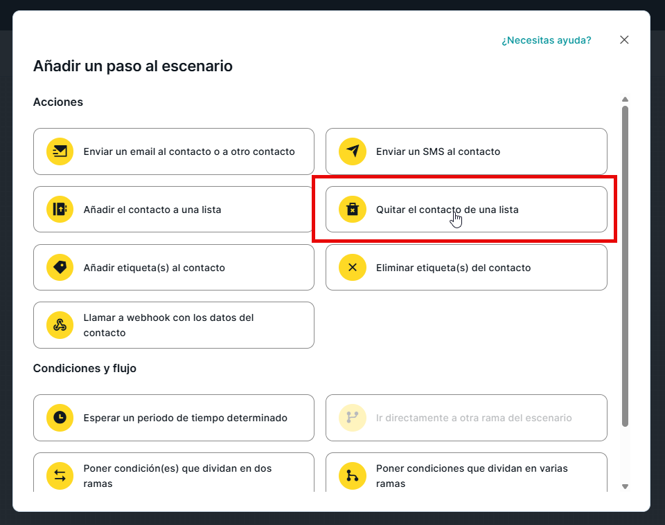 Si queremos añadir un paso que retire un contacto de una lista, lo primero que debemos hacer es pulsar el botón “+” y seleccionar la opción “Quitar el contacto de una lista” dentro de la categoría de “Acciones”.