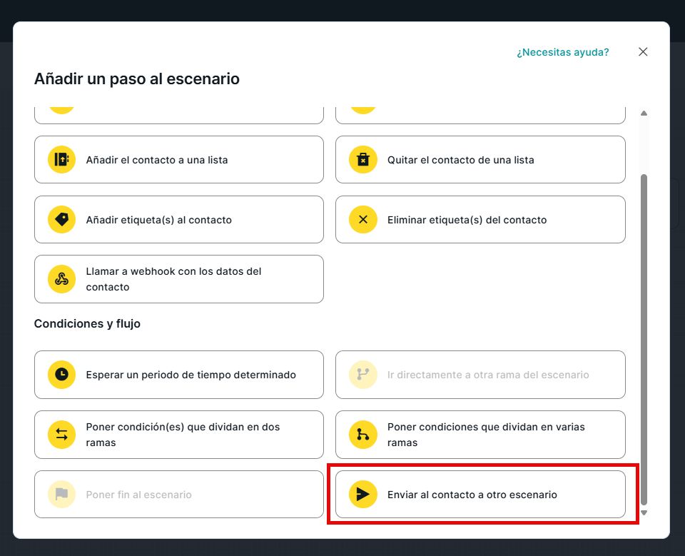Pulsa el botón «+» del editor del escenario y selecciona el paso «enviar al contacto a otro escenario» dentro de la categoría de «Condiciones y flujo».