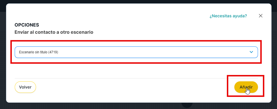 En la siguiente fase de la ventana, se te pedirá que selecciones el escenario al cual quieres enviar al contacto cuando llegue a este nodo. Elige el escenario en cuestión y pulsa el botón amarillo de «Añadir».