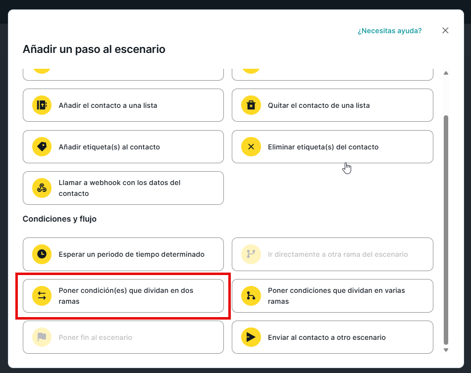Para utilizar esta opción, haz clic en el botón «+» del editor del escenario para añadir un nuevo paso y selecciona «Poner condición(es) que dividan en dos ramas» dentro de la categoría «Condiciones y flujo».