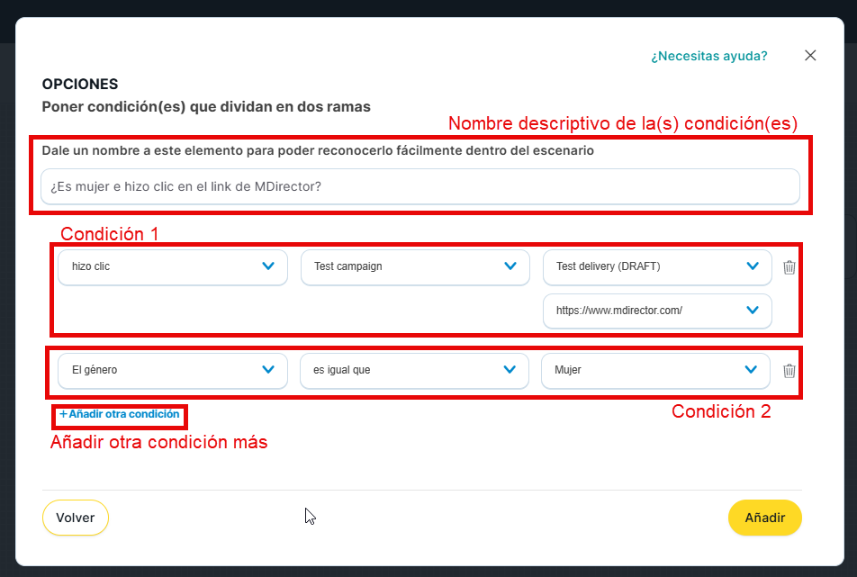 Ahora podremos asignar un nombre al nodo. Lo más recomendable es utilizar un nombre que refleje claramente la condición establecida, de forma que los caminos «sí» y «no» que se mostrarán a continuación tengan sentido. Si añadimos más de una condición, lo ideal es usar un nombre que las resuma de forma clara. El sistema para agregar condiciones es simple: por defecto, tenemos una primera condición y cada que queramos agregar una nueva, pulsaremos «+Añadir otra condición».