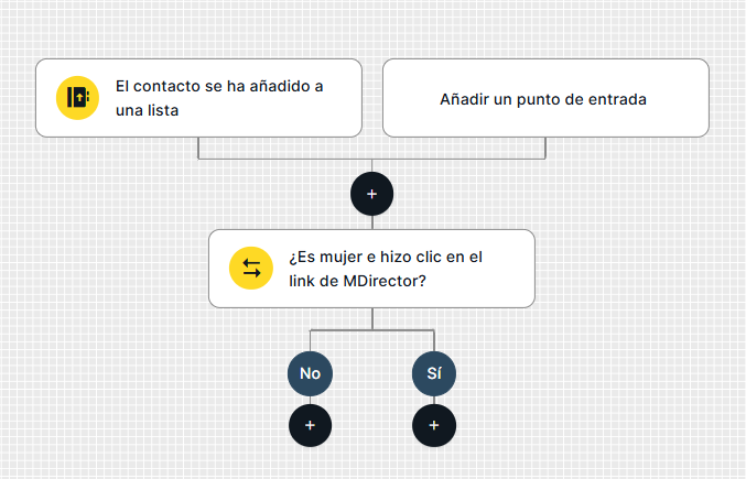 Podemos definir las condiciones eligiendo entre las opciones que ofrece MDirector. Estas se agrupan en dos categorías: condiciones basadas en los datos del contacto y condiciones relacionadas con la actividad del usuario. Por ejemplo, podríamos dividir la rama entre los contactos que sean mujeres y hayan hecho clic en un enlace concreto de un envío, y aquellos que no cumplan una o ambas condiciones.