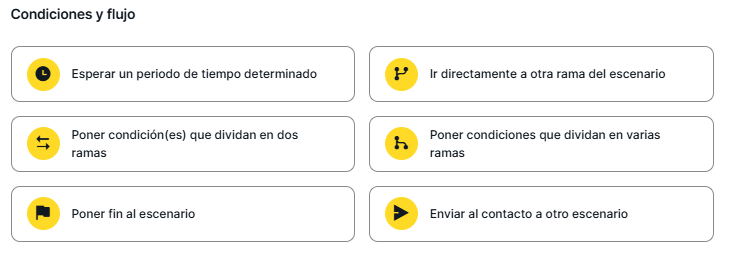 Los pasos de un escenario representan las distintas etapas que atraviesa un contacto en función de su comportamiento o del cumplimiento de ciertas condiciones. Siempre se sitúan después de los puntos de entrada y, aunque es habitual incluir varios pasos, no se recomienda crear escenarios demasiado largos. En esos casos, es preferible dividirlos en varios escenarios más simples. Estos pasos se agrupan en dos grandes categorías: Acciones y Condiciones y flujo.