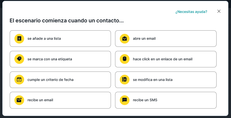 Los puntos de entrada de un escenario de Marketing Automation en MDirector son las condiciones que activan el inicio de un flujo automatizado. Es decir, cuando un contacto cumple alguno de estos criterios, entra automáticamente en la secuencia que hayas configurado. Los puntos de entrada disponibles son que el escenario comienza cuando un contacto: