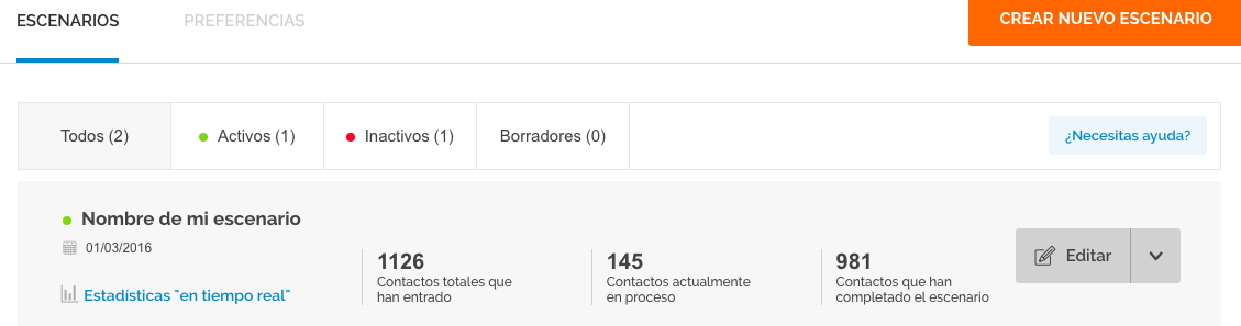 Comparte este post: Generic selectors Exact matches only Search in title Search in content Post Type Selectors Índice de este artículo (MDirector) Estadísticas a nivel de escenario Índice de este artículo Cada uno de los escenario tendrá información sobre los contactos que han entrado, los que están en proceso y los que han finalizado. Para ello, haz clic en el enlace Escenarios de la cabecera general de MAutomation. En cada uno de los escenarios activos verás esta información. Comparte este post: PrevPrevio(MDirector) Estadísticas en «tiempo real» Siguiente(MDirector) Desactivar y eliminar escenariosNext (MDirector) ¿Cómo puedo crear filtros de presión de marketing? Leer más ➜ (MDirector) Cómo solicitar la eliminación de cuenta Leer más ➜ (MDirector) ¿Cómo reportar Spam? Leer más ➜ (MDirector) ¿Qué hago si no me ha llegado el código temporal de acceso (OTP) a mi email? Leer más ➜ ¿Todavía tenés dudas? Contacta a un experto
