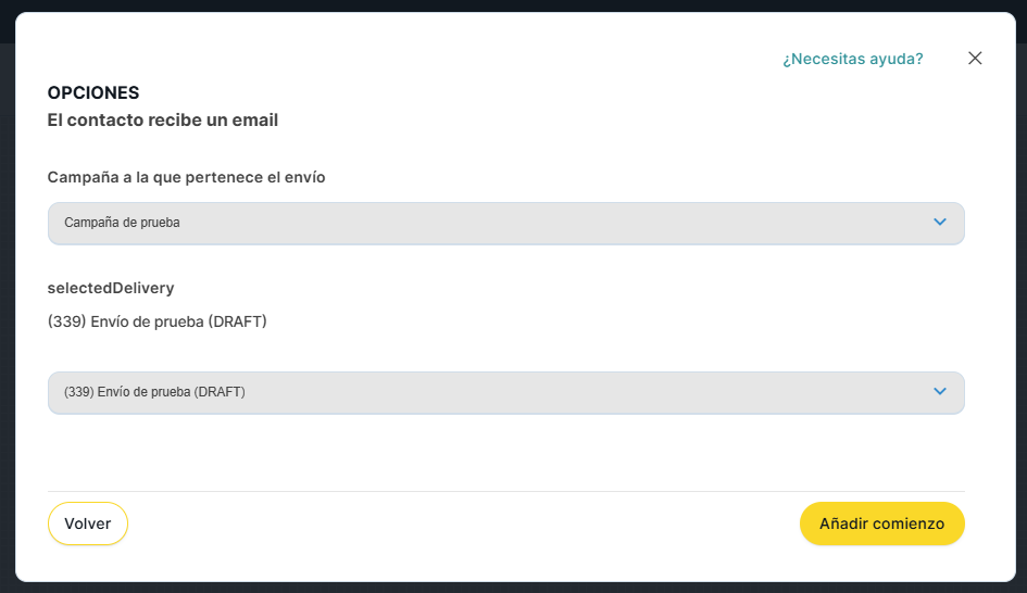 Aquí, seleccionaremos el envío que hayamos creado previamente en el apartado de Email Marketing y la campaña a la que pertenece el mismo.