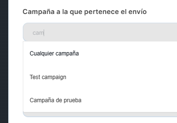 Si tenemos muchos envíos o campañas, los desplegables cuentan con una barra de búsqueda para encontrarlos con mayor facilidad.