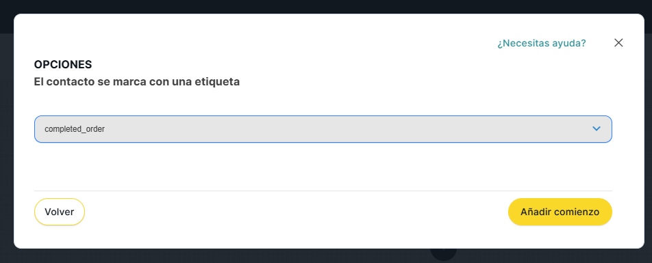 Se abrirá una ventana con un selector que muestra todas las etiquetas creadas en la subcuenta. Seleccionamos la etiqueta que queremos usar como desencadenante para que el contacto entre en el flujo.