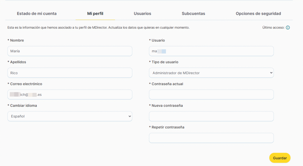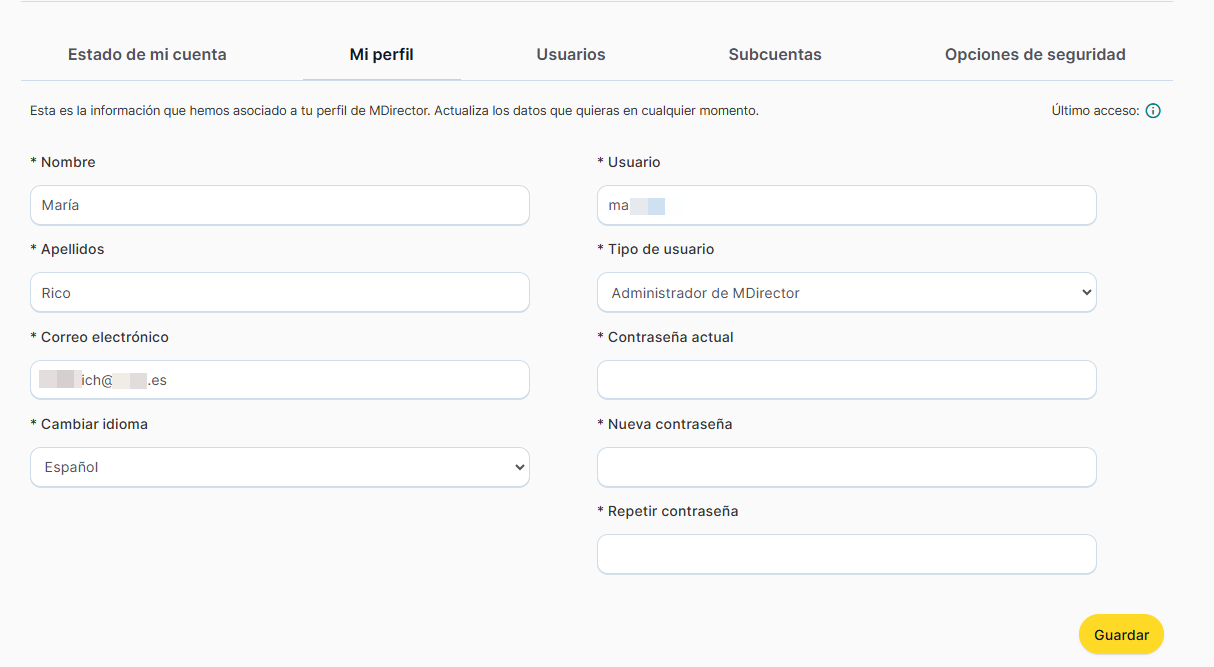 Para modificar las credenciales de acceso a la cuenta de MDirector, se deben seguir los siguientes pasos: