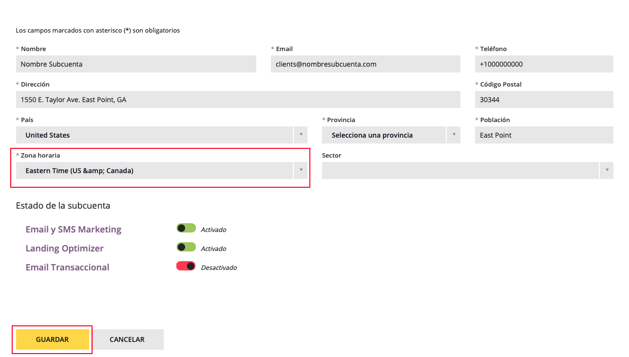 Todos los envíos programados se enviarán teniendo en cuenta la zona horaria establecida para la subcuenta.