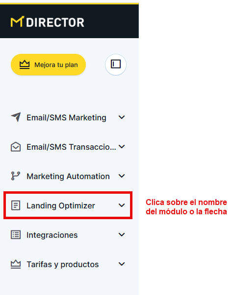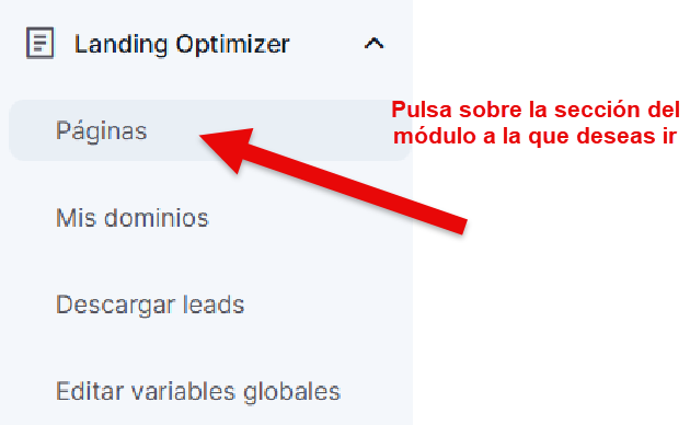 Para acceder a él, ve al menú lateral, ubicado en el lado izquierdo de tu pantalla, y, asegurándote de que este está descolapsado, clica sobre el título o la flecha a su derecha, lo que hará que se desplieguen las diferentes secciones del módulo: Páginas, Mis dominios, Descargar leads y Editar variables globales. Para entrar al módulo, tendremos que clicar sobre la sección a la que queramos viajar.