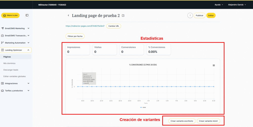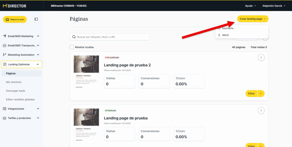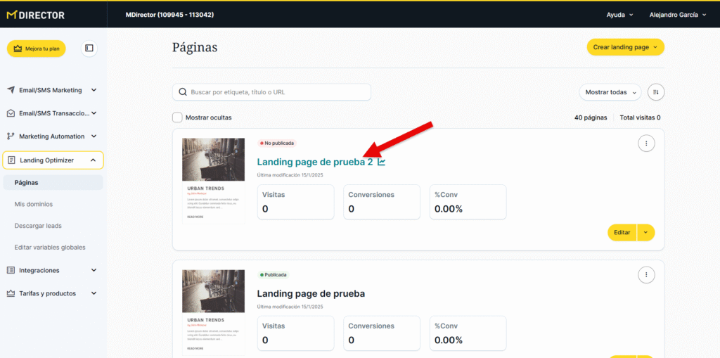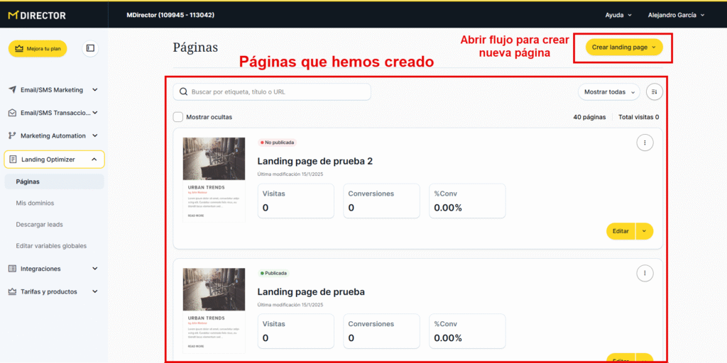 Desde esta sección podremos ver, gestionar y editar las páginas de aterrizaje que ya hayamos creado o, como se ha explicado anteriormente, crear una nueva.