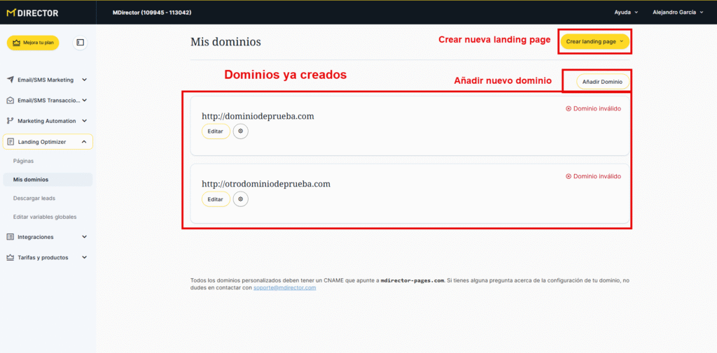 Como se ha mencionado, en esta sección podemos encontrar, en primer lugar, el botón amarillo para crear una nueva landing page, a pesar de que la sección está centrada en la gestión de los dominios. A continuación, aparece un botón para añadir un nuevo dominio y, más abajo, se muestran los dominios que ya hemos agregado.