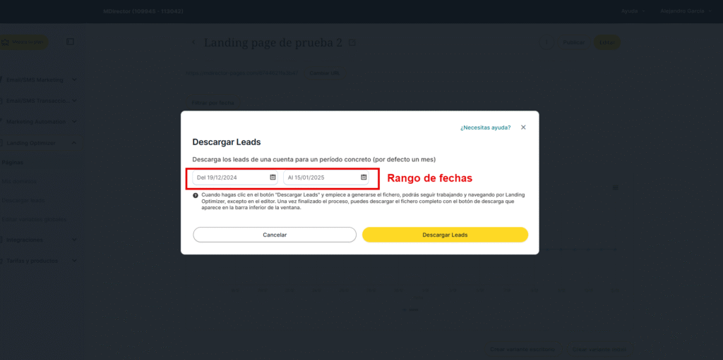 Esta sección se abre en una ventana. Consta de una única función: poder descargar todos los leads de la subcuenta para un periodo específico de tiempo que podremos definir aquí mismo.
