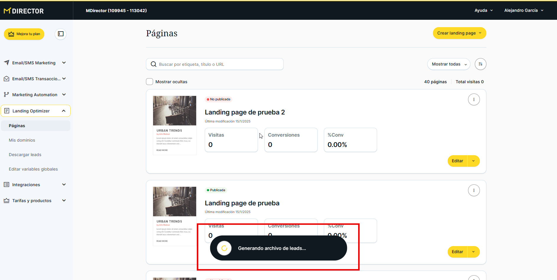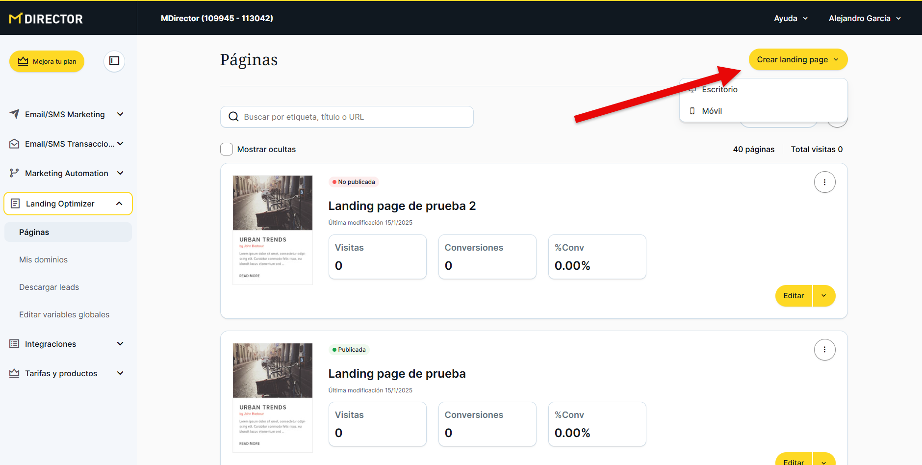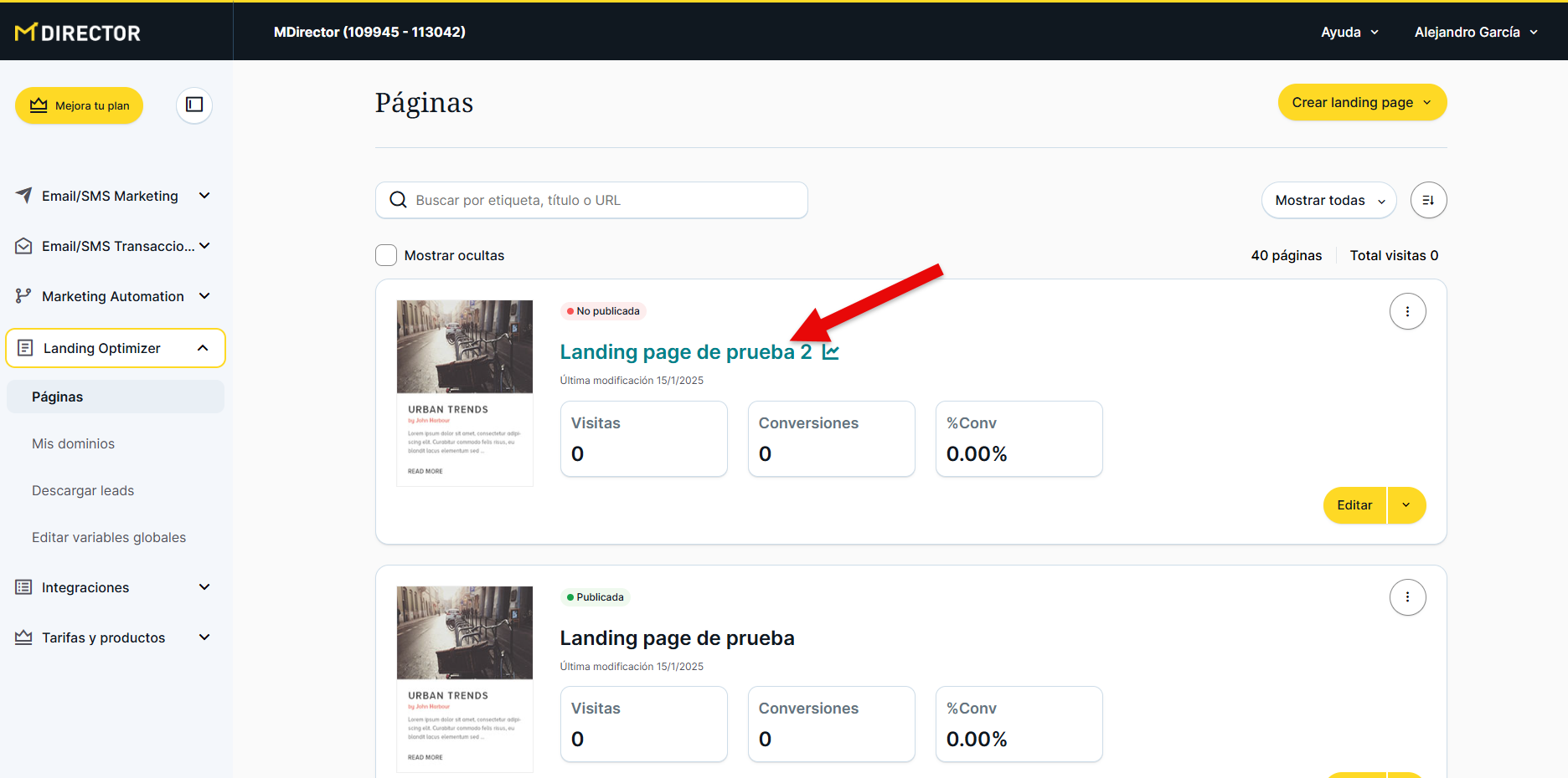 Desde esta sección podremos ver, gestionar y editar las páginas de aterrizaje que ya hayamos creado o, como se ha explicado anteriormente, crear una nueva.