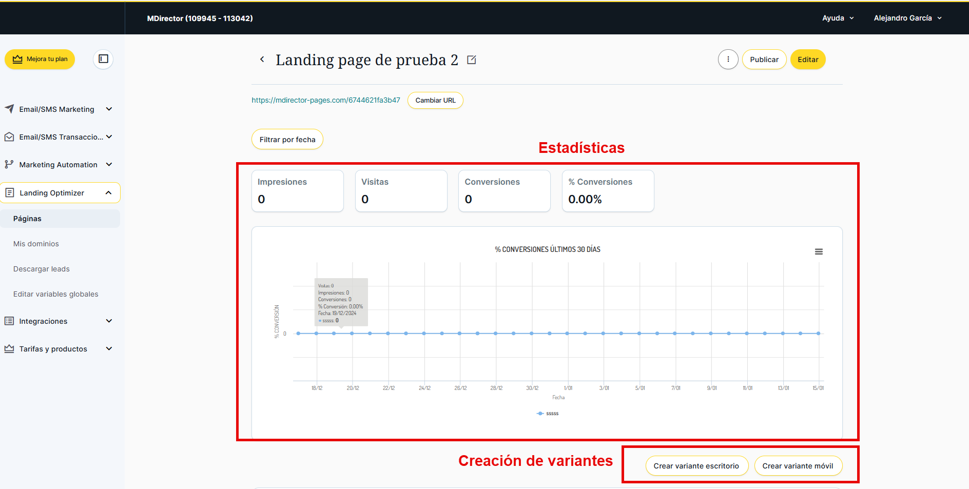 También es el punto desde el que podremos consultar las estadísticas de cada una, ver los leads o crear variantes de las mismas, lo cual es especialmente útil para crear versiones de escritorio y dispositivos móviles. A este punto accederemos simplemente pulsando sobre el nombre de la página en cuestión.