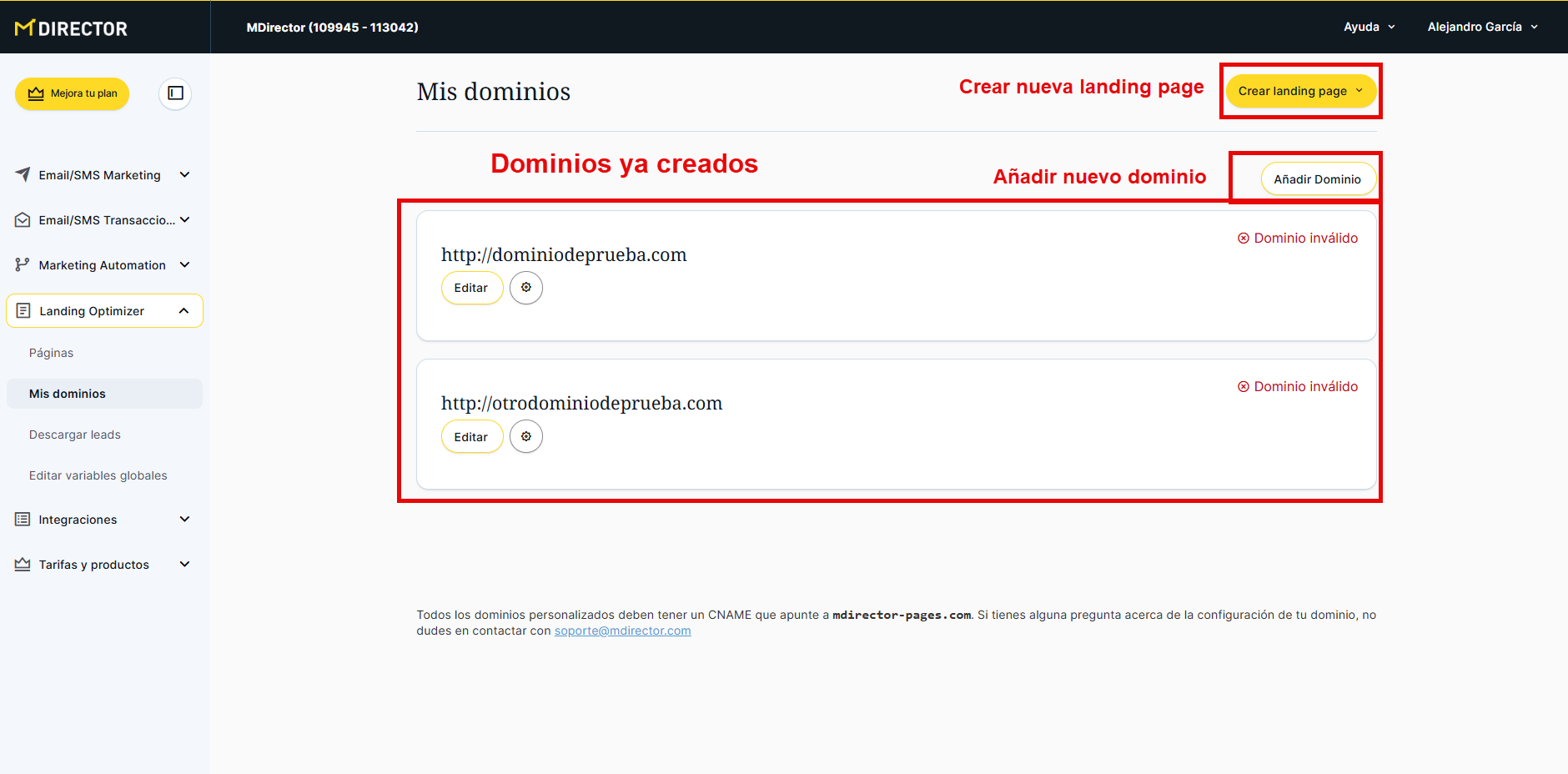 Como se ha mencionado, en esta sección podemos encontrar, en primer lugar, el botón amarillo para crear una nueva landing page, a pesar de que la sección está centrada en la gestión de los dominios. A continuación, aparece un botón para añadir un nuevo dominio y, más abajo, se muestran los dominios que ya hemos agregado.