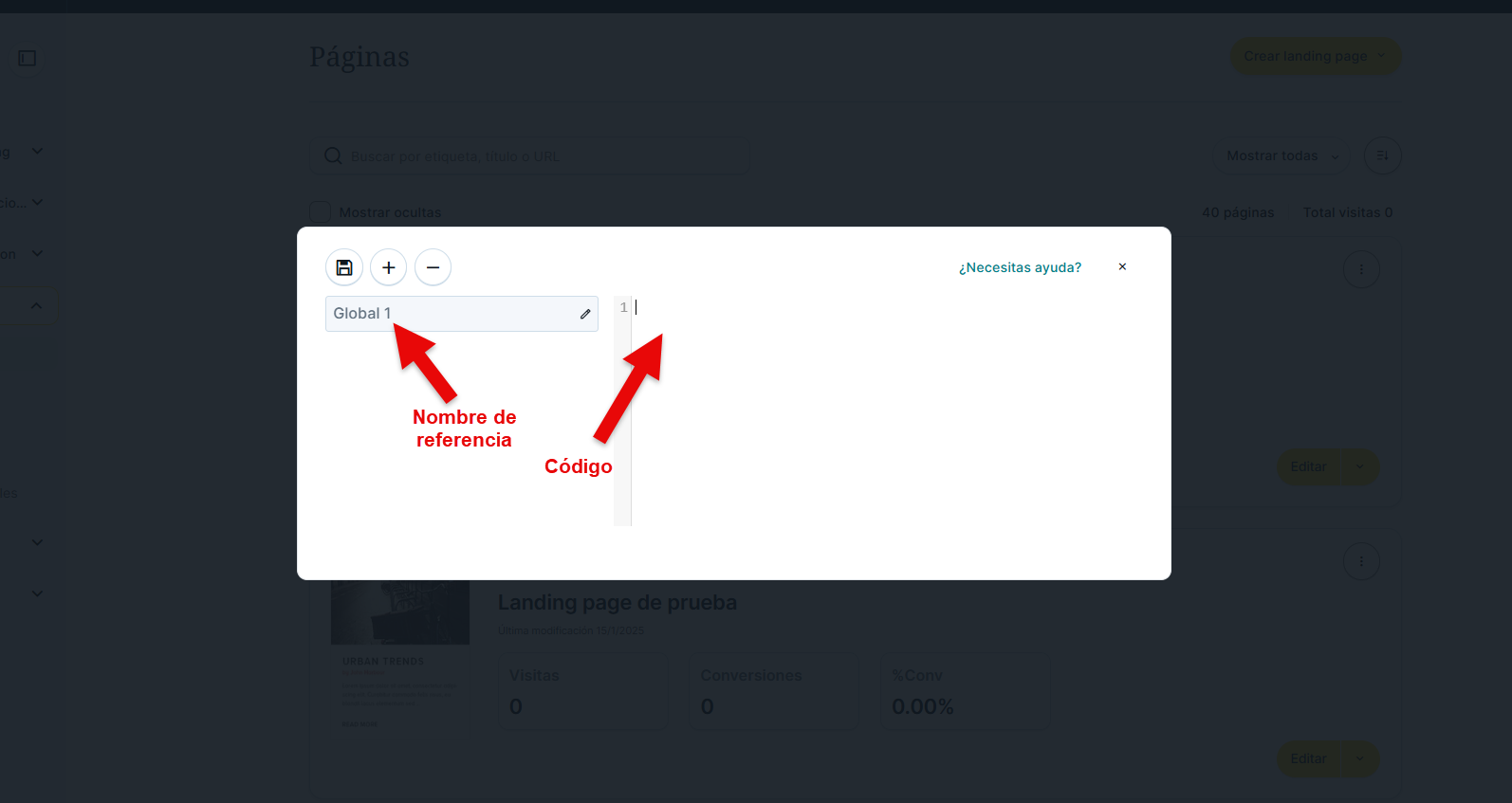 Desde esta sección, que también se abre en una ventana, podremos crear y editar aquellos elementos que queremos que sean comunes a diferentes landings, o diferentes partes de una misma landing, y a los que luego podremos acceder durante la edición de la página. Desde aquí, les asignaremos una nomenclatura y el código.