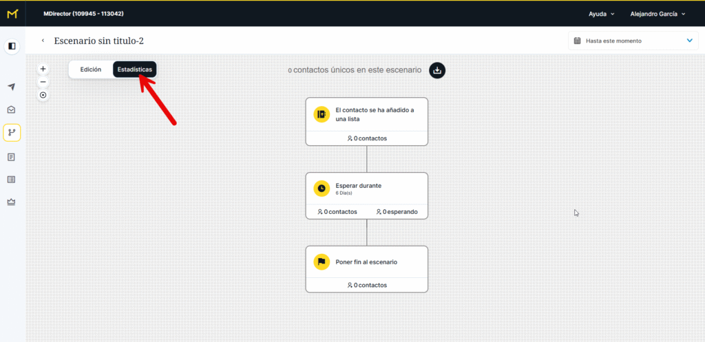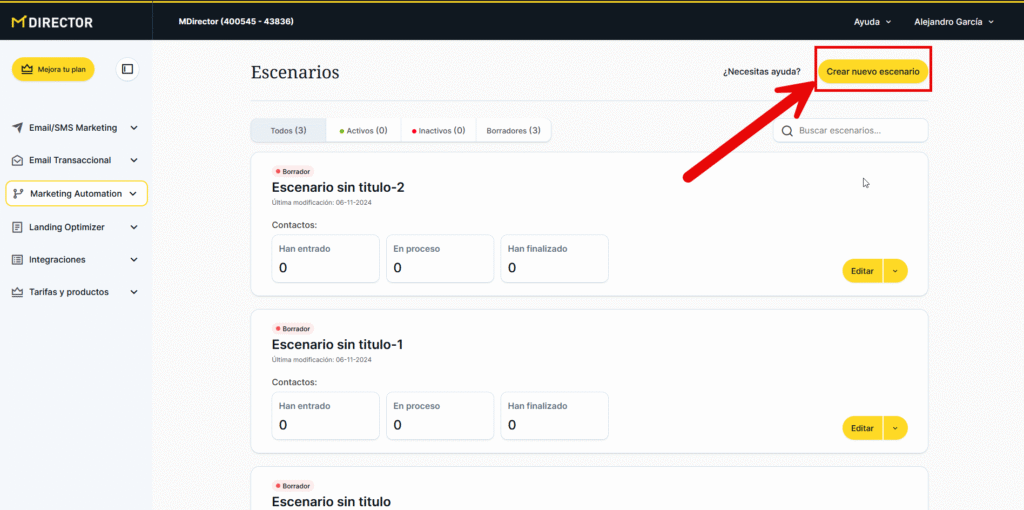 De igual forma que ocurre en el módulo de Email/SMS Marketing con la creación de envío y en el de Landing Optimizer con la creación de páginas de aterrizaje, en Marketing Automation hallamos en todos sus apartados -uno solo, en este caso- un botón amarillo destacado en la esquina superior derecha que dice «Crear nuevo escenario».