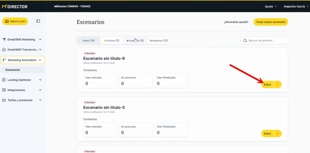 En esta página podrás ver todos los escenarios que hayas creado, siempre que no hayan sido eliminados. Estos se agrupan mediante un sistema de pestañas según su estado: todos los escenarios, activos, inactivos y borradores. Desde aquí podrás duplicarlos, eliminarlos o acceder a ellos para editarlos y consultar sus estadísticas.