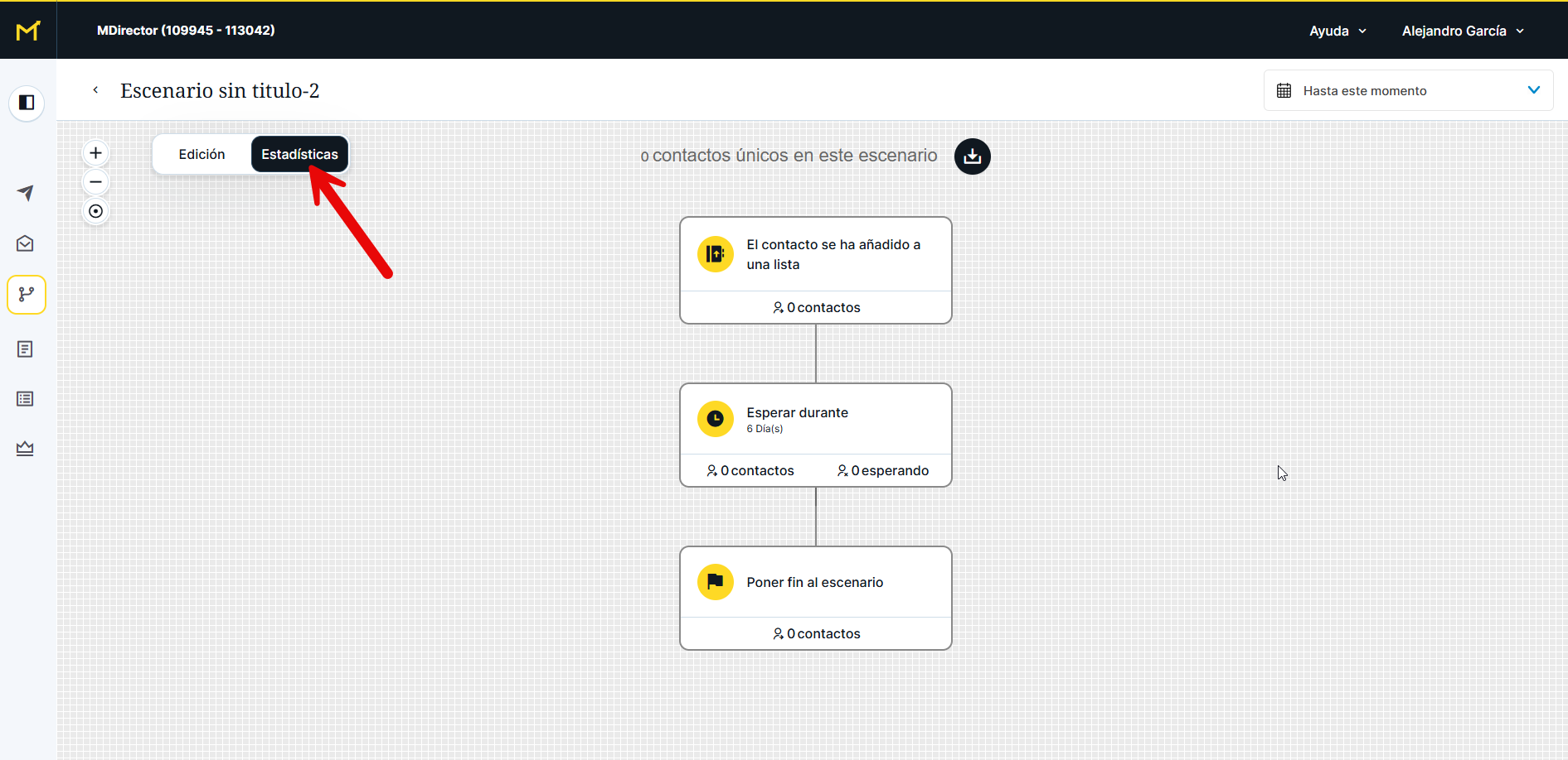 En esta página podrás ver todos los escenarios que hayas creado, siempre que no hayan sido eliminados. Estos se agrupan mediante un sistema de pestañas según su estado: todos los escenarios, activos, inactivos y borradores. Desde aquí podrás duplicarlos, eliminarlos o acceder a ellos para editarlos y consultar sus estadísticas.
