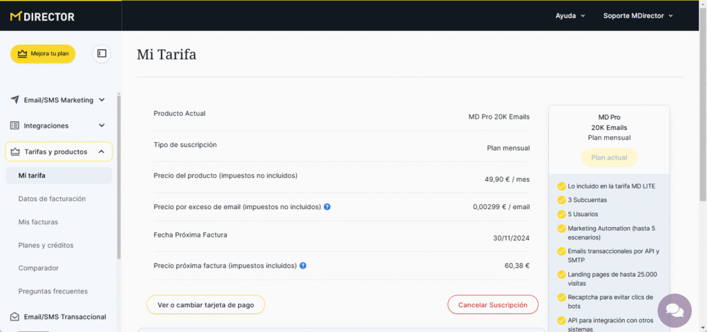 - Cuando entres en tu cuenta de MDirector, en el menú lateral de la izquierda verás «Tarifas y PRecios», y abriendo este puedes acceder al submenú «Mi tarifa». Desde aquí podrás ver el plan qué tienes contratado actualmente, consultar o cambiar la tarjeta de pago y cancelar la suscripción.