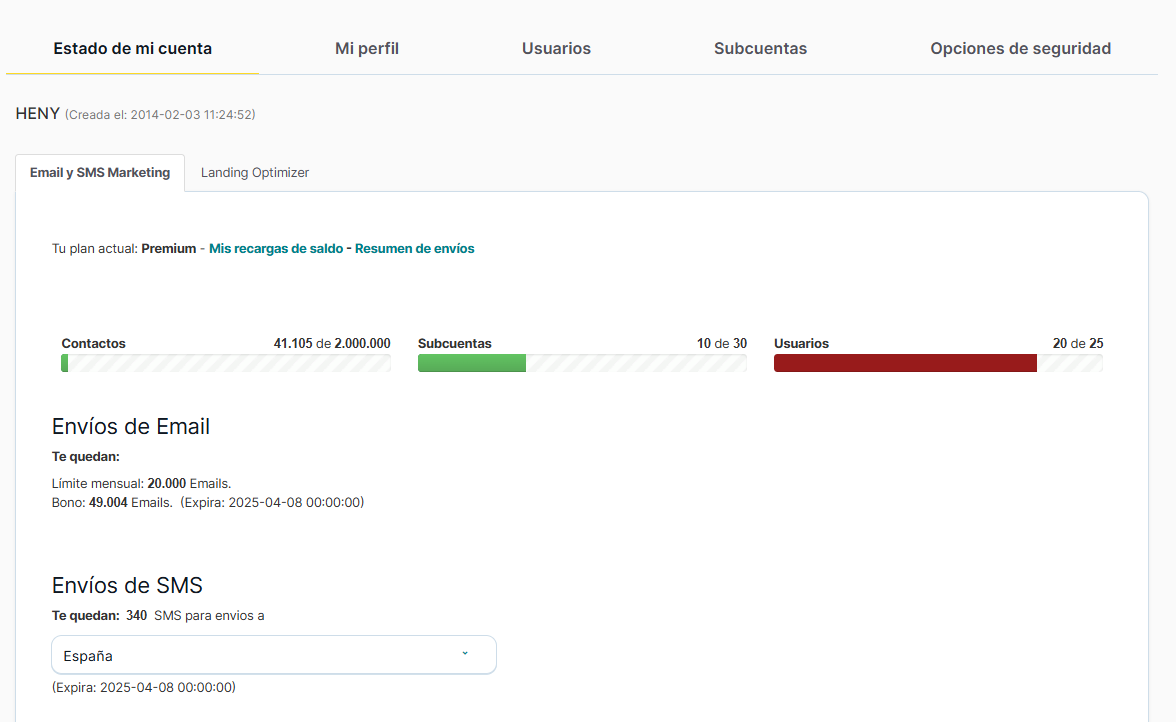 En la pestaña «Estado de mi cuenta» verás la informacion de emails y sms que tienes disponibles en ese momento.