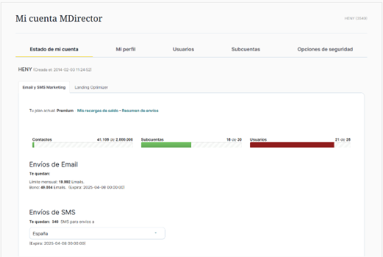 Desde esta sección podrás acceder al estado de cada uno de los productos que tengas contratados. Tanto a la parte de Email y SMS Marketing como a Landing Optimizer.